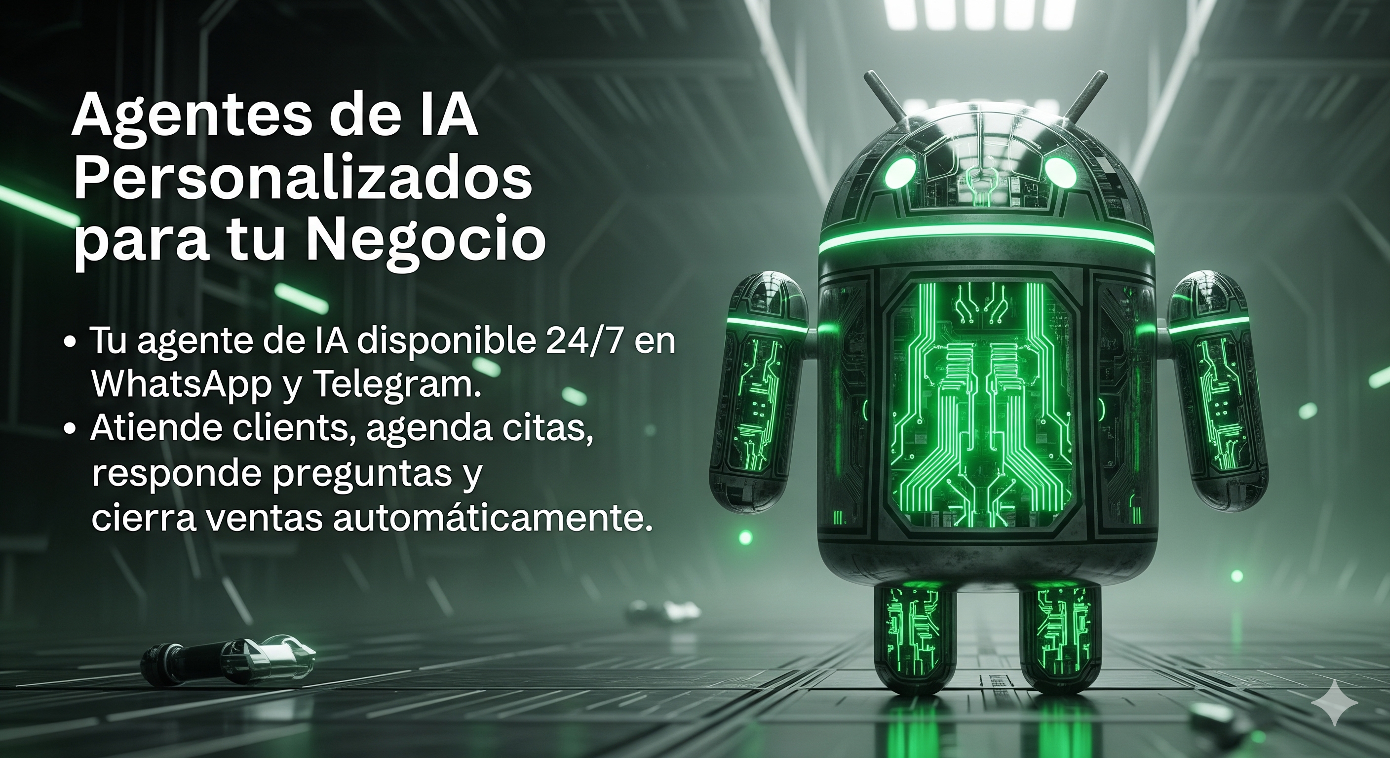 Tu agente de IA disponible 24/7 en WhatsApp y Telegram. Atiende clientes, agenda citas, responde preguntas y cierra ventas automaticamente. Desde $49 USD/mes.